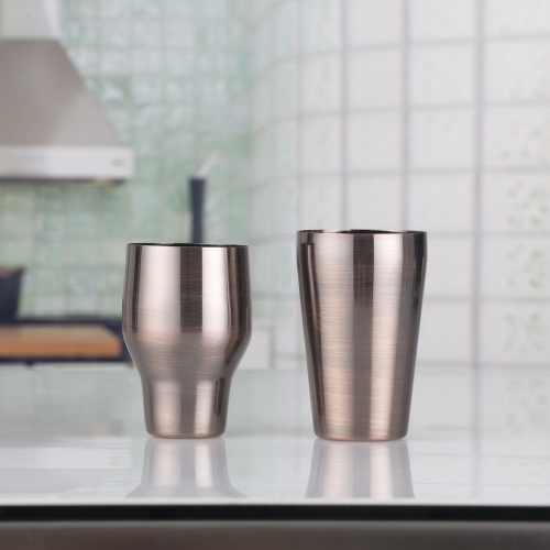 This two-part cocktail shaker is made of stainless steel with a copper plated exterior and brushed interior. The shaker cup has a conical shape and is comfortable to hold in the hand.